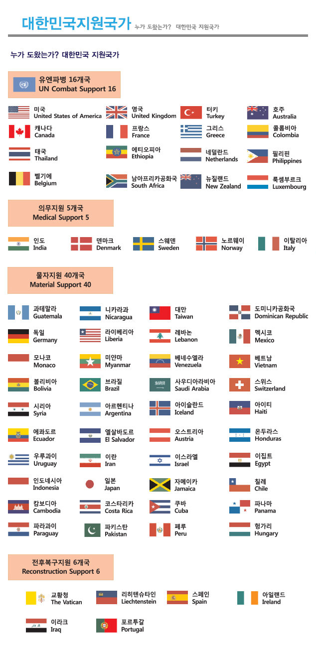 6·25전쟁 때 우리를 도운 나라는 총 60개국이다. 정부가 감사표시와 보은활동을 하는 22개국은 전투지원 16개국(미국·캐나다·호주·뉴질랜드·영국·프랑스·그리스·터키·벨기에·네덜란드·룩셈부르크·태국·필리핀·남아프리카공화공화국·에티오피아·콜롬비아)과 의료지원 6개국(인도·스웨덴·노르웨이·덴마크·이탈리아·서독) 등으로 참전국으로 분류한다.