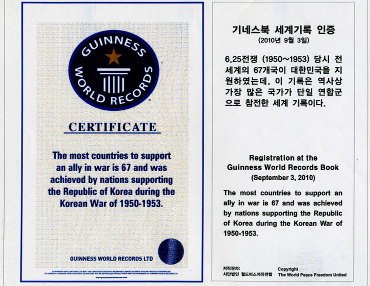 *The most countries to support an ally in war is 67 and was achieved by nations supporting the Republic of Korea during the Korean War of 1950-1953. 기네스북 세계기록인증 (2010년 9월 3일)